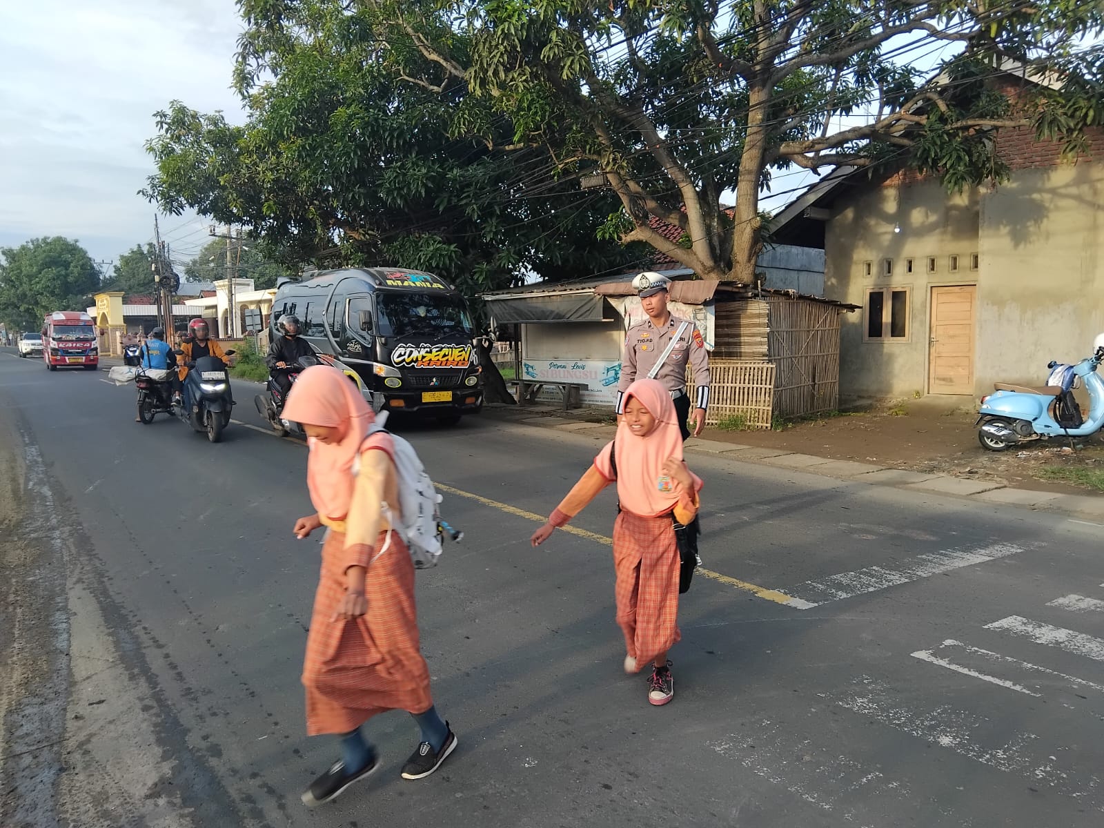 Di tengah lalu lintas yang mulai ramai, seorang polisi berdiri sigap, membantu anak-anak melintasi jalan dengan aman.