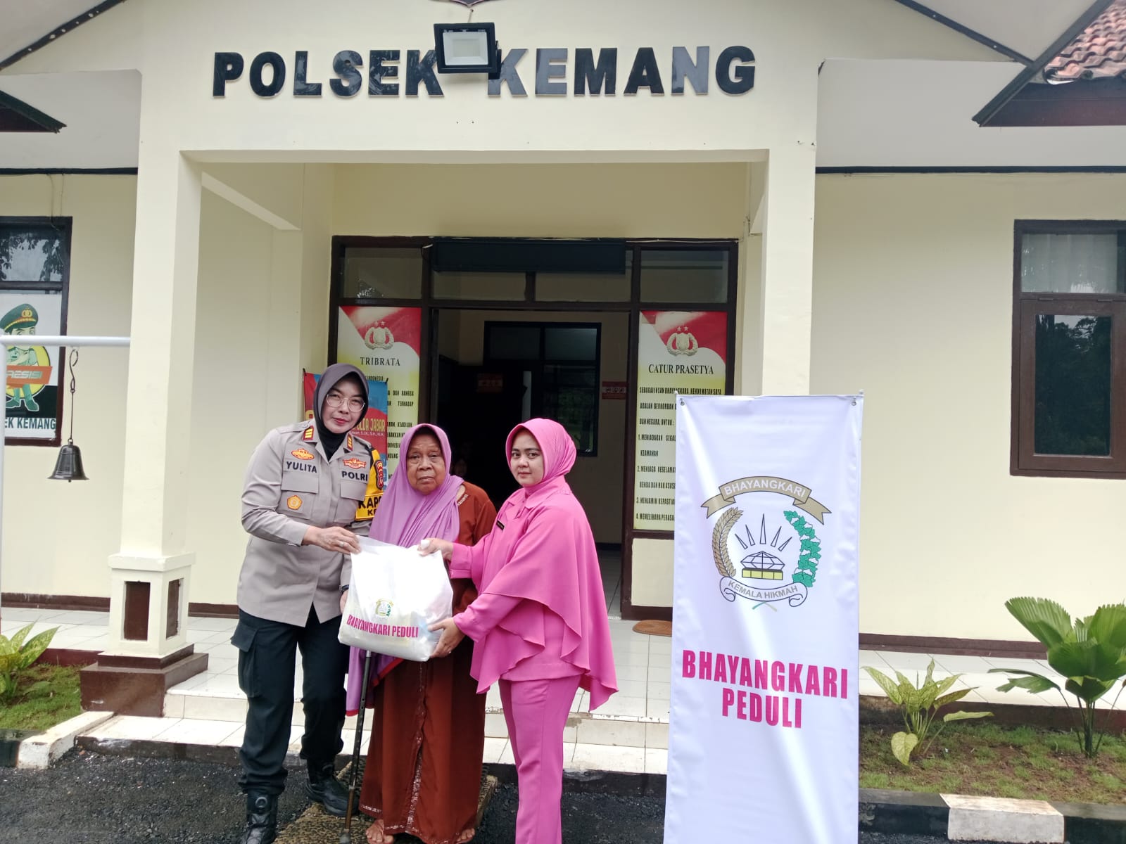 – Foto: Kapolsek Kemang, AKP YULITA HERIYANTI, SH, MH, menyerahkan paket sembako kepada warga Desa Jampang.