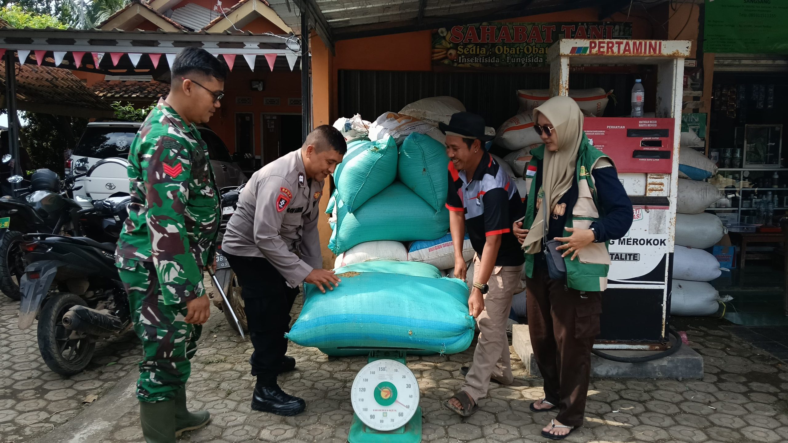 Kehadiran Babinsa Desa Kertasari, Kopka Nana Suharna, bersama Babinmas Aiptu Djon Amran, turut memberikan rasa aman dan kelancaran dalam proses penimbangan serta pengangkutan gabah dari kelompok tani.